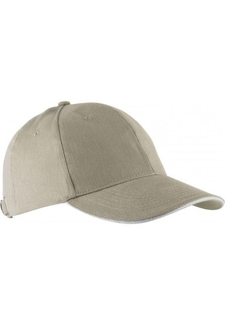 100 % heavy brushed cotton Twill. Contrast sandwich peak. Size adjuster with metal buckle and grommet.