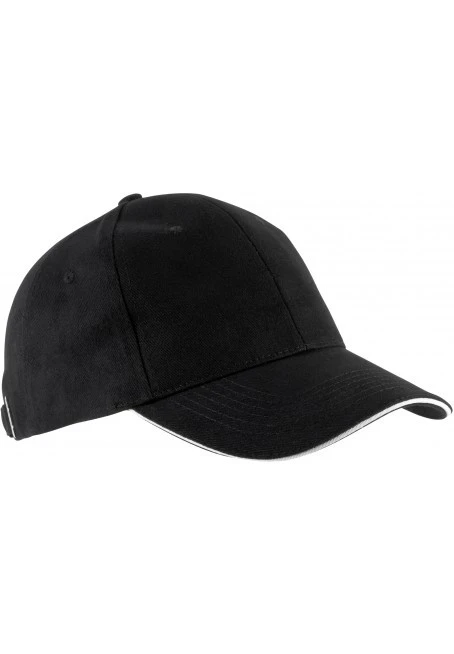 100 % heavy brushed cotton Twill. Contrast sandwich peak. Size adjuster with metal buckle and grommet.