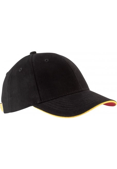 100 % heavy brushed cotton Twill. Contrast sandwich peak. Size adjuster with metal buckle and grommet.