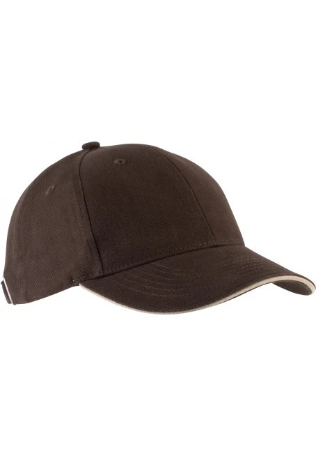 100 % heavy brushed cotton Twill. Contrast sandwich peak. Size adjuster with metal buckle and grommet.