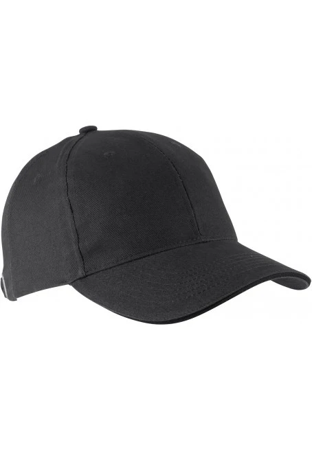 100 % heavy brushed cotton Twill. Contrast sandwich peak. Size adjuster with metal buckle and grommet.