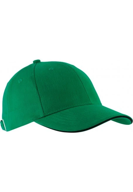 100 % heavy brushed cotton Twill. Contrast sandwich peak. Size adjuster with metal buckle and grommet.