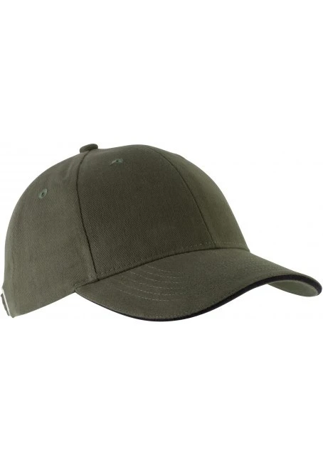 100 % heavy brushed cotton Twill. Contrast sandwich peak. Size adjuster with metal buckle and grommet.