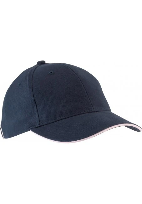 100 % heavy brushed cotton Twill. Contrast sandwich peak. Size adjuster with metal buckle and grommet.