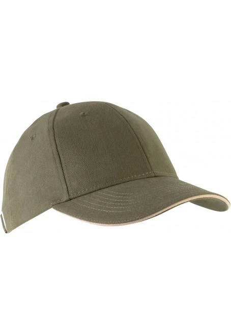 100 % heavy brushed cotton Twill. Contrast sandwich peak. Size adjuster with metal buckle and grommet.