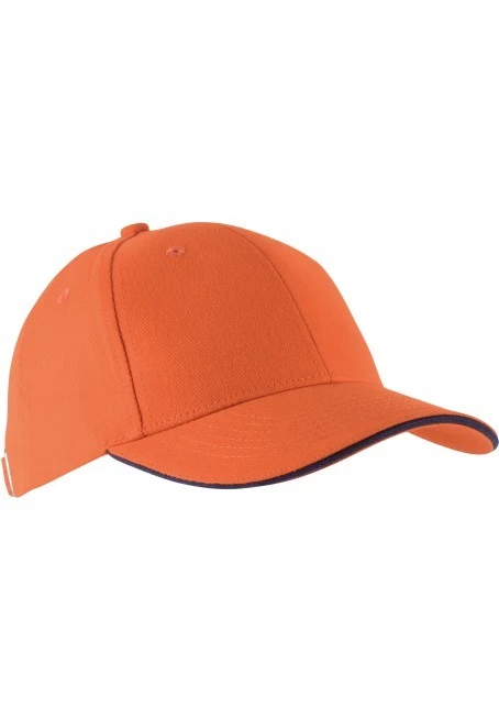 100 % heavy brushed cotton Twill. Contrast sandwich peak. Size adjuster with metal buckle and grommet.