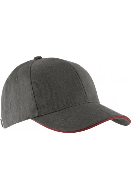 100 % heavy brushed cotton Twill. Contrast sandwich peak. Size adjuster with metal buckle and grommet.