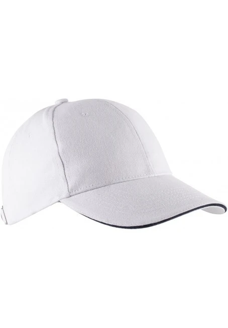 100 % heavy brushed cotton Twill. Contrast sandwich peak. Size adjuster with metal buckle and grommet.