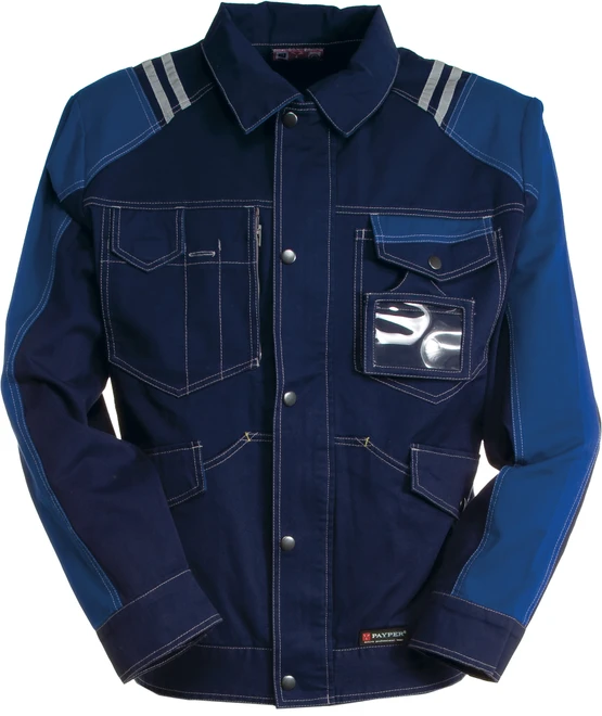 All-season jacket with contrasting two-tone inserts and stitching , jeans-type fitted model with front fastening, zip and covering flap with buttons, adjustable cuffs and waist with button, two kangaroo pockets with LOCK SYSTEM flap, two chest pockets, one with LOCK SYSTEM detachable, foldaway badge holder, mobile phone holder; reflective piping on back; reflective stripes on the shoulders for greater safety and visibility