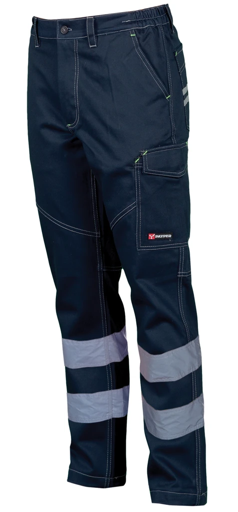 All-season unisex trousers with cat. 1 reflective stripes, side elastic and waist belt loops, zip fastening with plastic button, two classic front pockets, one side pocket with LOCK SYSTEM, one tape measure pocket, two back pockets, one with flap and one open with Velcro flap, contrasting inserts and stitching, reflective stripes on the back pocket, triple stitched seams