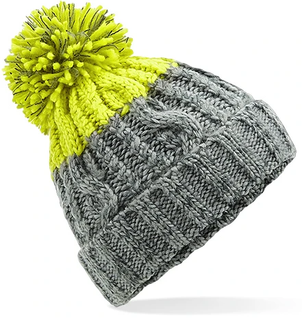 Features TearAway label for ease of rebranding, heavyweight multi yarn cable knit design, bold two colour design, luxury pom pom, luxurious Shearling thermal band for extra warmth, cuffed design for optimal decoration