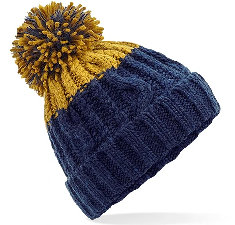 Features TearAway label for ease of rebranding, heavyweight multi yarn cable knit design, bold two colour design, luxury pom pom, luxurious Shearling thermal band for extra warmth, cuffed design for optimal decoration