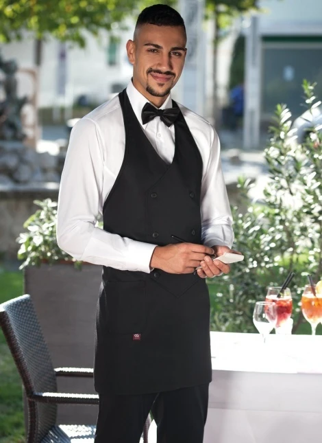 Highly fashionable, elegant apron with a waistcoat top. Clever cut and figure-hugging silhouette. Waistcoat with six decorative buttons and deep V neck. The neck and waist ties are individually adjustable by velcro fastening. Side patch pocket (15 x 13 cm).