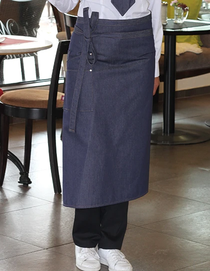 Stylish apron made of hard-wearing jeans fabric. Dark wash with brown seams and rivets for the typical denim look. With two large patch pockets und two pen sections. Easy-care, colourfast, industrial laundering and finishing allowed.