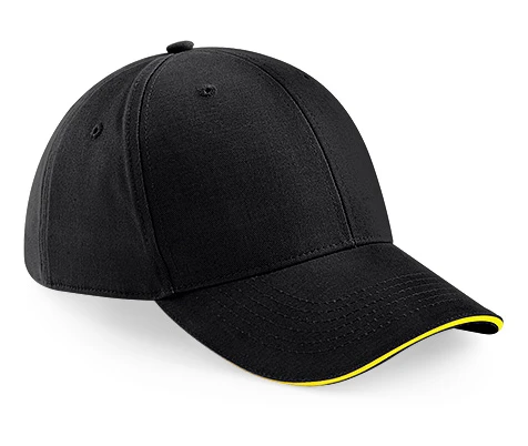TearAway label for ease of rebranding, 6 panel design, mid profile, pre-curved peak, contrasting colour sandwich peak, structured front panels,