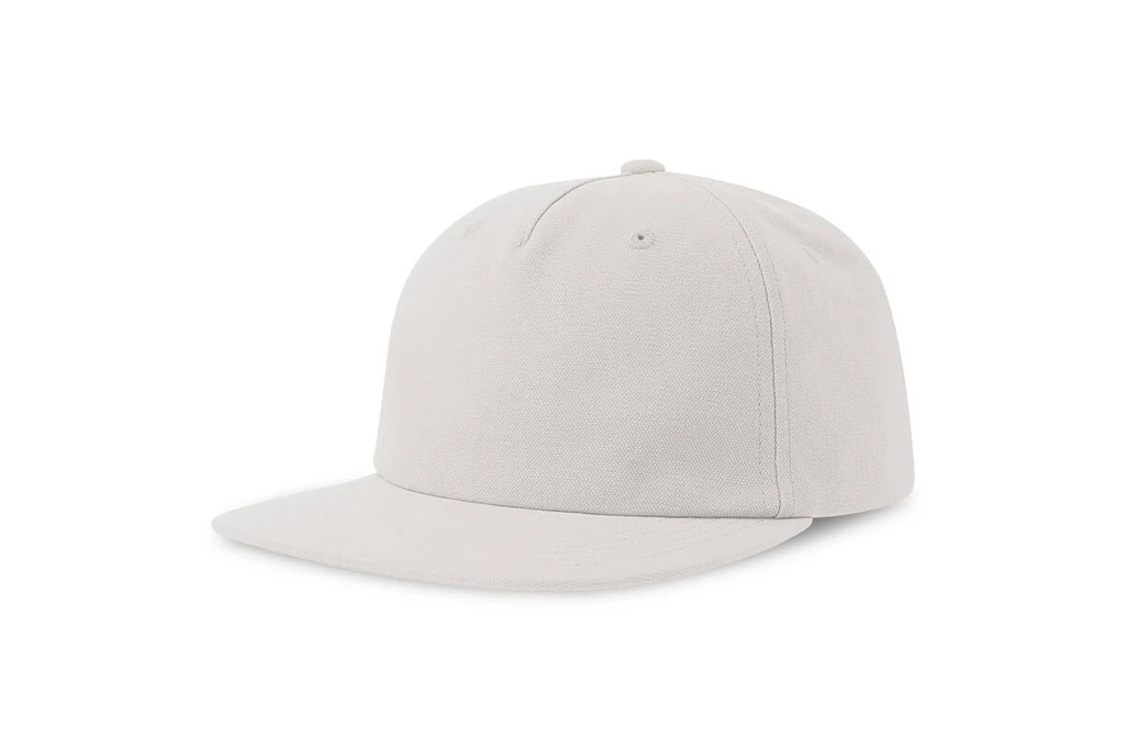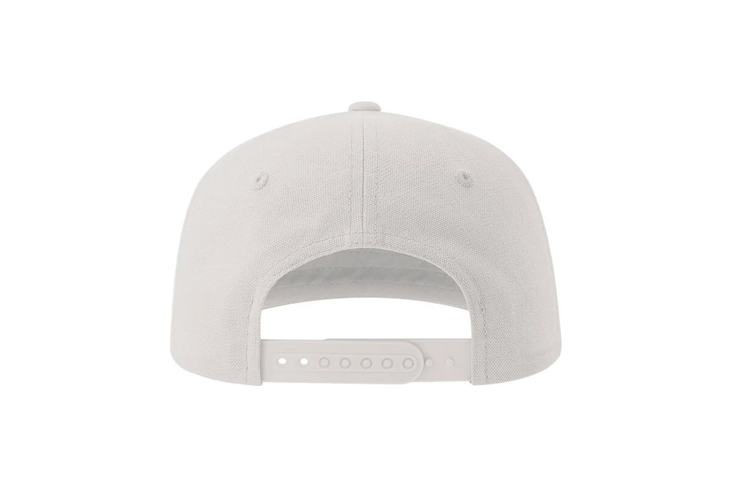 Unstructured beanie made from a blend of recycled and organic cotton canvas. It has a flat peak and a recycled snapback closure.