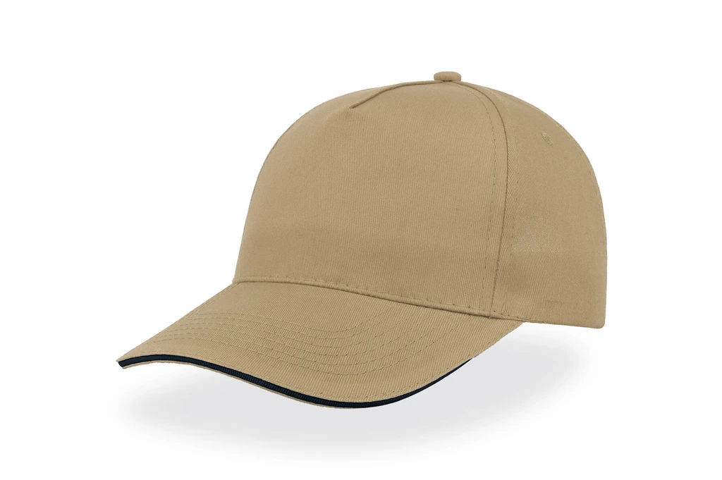 5-panel cap made of 100% lightweight cotton with a contrasting sandwich on the peak, suitable for all events and the promotional world. Velcro closure at the back.