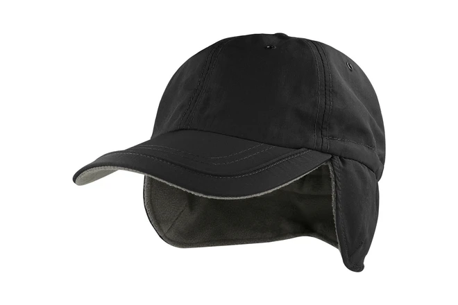 Outdoor winter hat with ear flaps made of recycled nylon. Water-repellent exterior and recycled polar fleece inside. Unstructured front panels and curved visor. Adjustable closure with elastic cords and stopper.