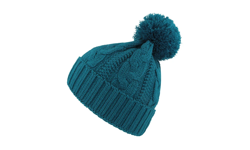 Warm beanie with cable knit pattern, made with thick yarn and fleece lining,enriched by a big pompon, ideal for trendy urban style.
