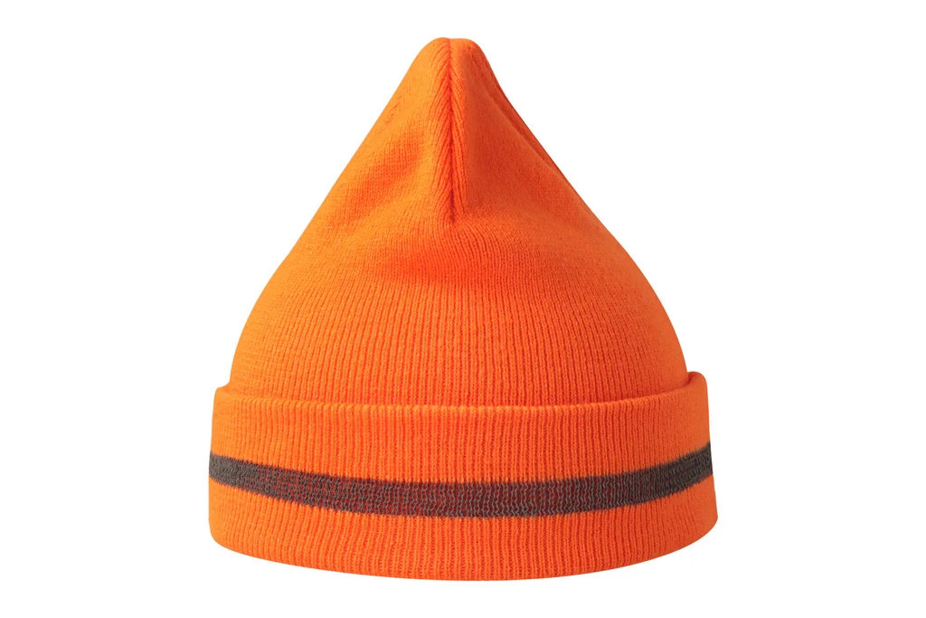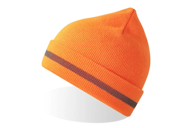 Warm acrylic knit beanie with reflective silver yarn band.