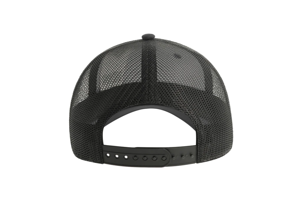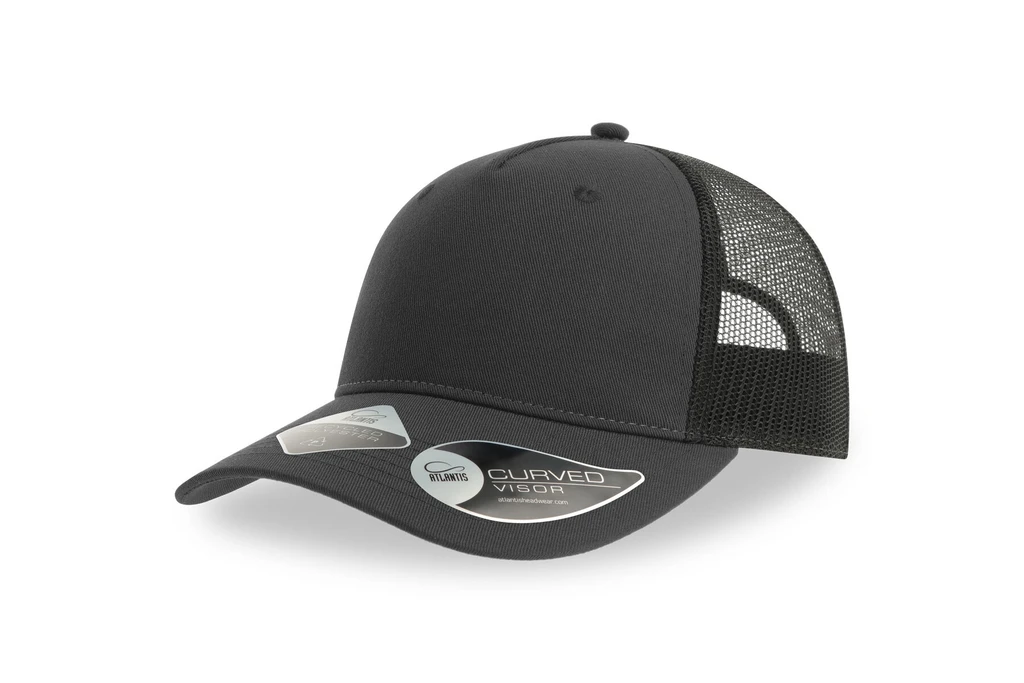 Classic 5 panel trucker cap in recycled polyester twill. Recycled mesh and snapback closure. Wide crown for embroideries and patches. Light and breathable shape for everyday use.