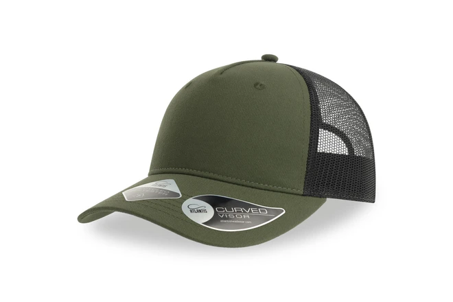Classic 5 panel trucker cap in recycled polyester twill. Recycled mesh and snapback closure. Wide crown for embroideries and patches. Light and breathable shape for everyday use.