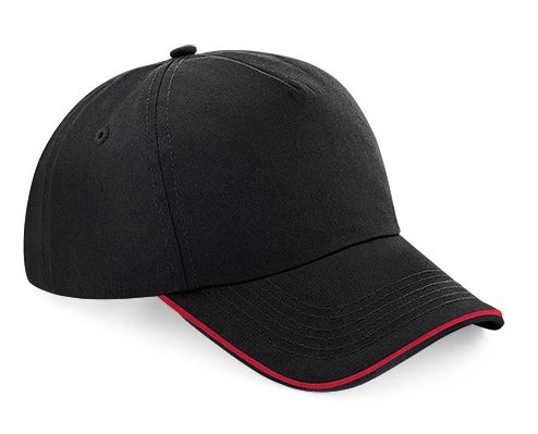 TearAway label for ease of rebranding, structured front panel, 5 panel design, pre-curved peak, contrasting colour piped peak edge, stitched ventilation eyelets, perfect for print and embroidery, self fabric strap with tri-glide buckle