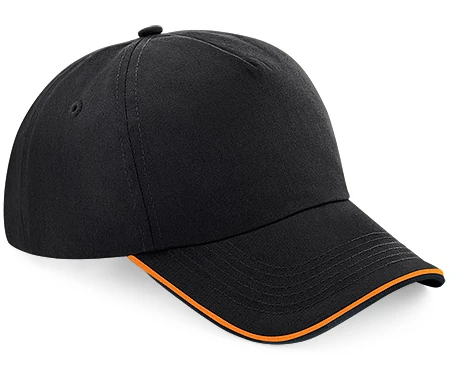 TearAway label for ease of rebranding, structured front panel, 5 panel design, pre-curved peak, contrasting colour piped peak edge, stitched ventilation eyelets, perfect for print and embroidery, self fabric strap with tri-glide buckle