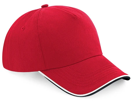 TearAway label for ease of rebranding, structured front panel, 5 panel design, pre-curved peak, contrasting colour piped peak edge, stitched ventilation eyelets, perfect for print and embroidery, self fabric strap with tri-glide buckle