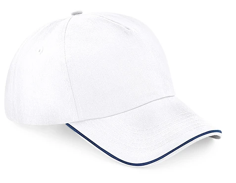 TearAway label for ease of rebranding, structured front panel, 5 panel design, pre-curved peak, contrasting colour piped peak edge, stitched ventilation eyelets, perfect for print and embroidery, self fabric strap with tri-glide buckle