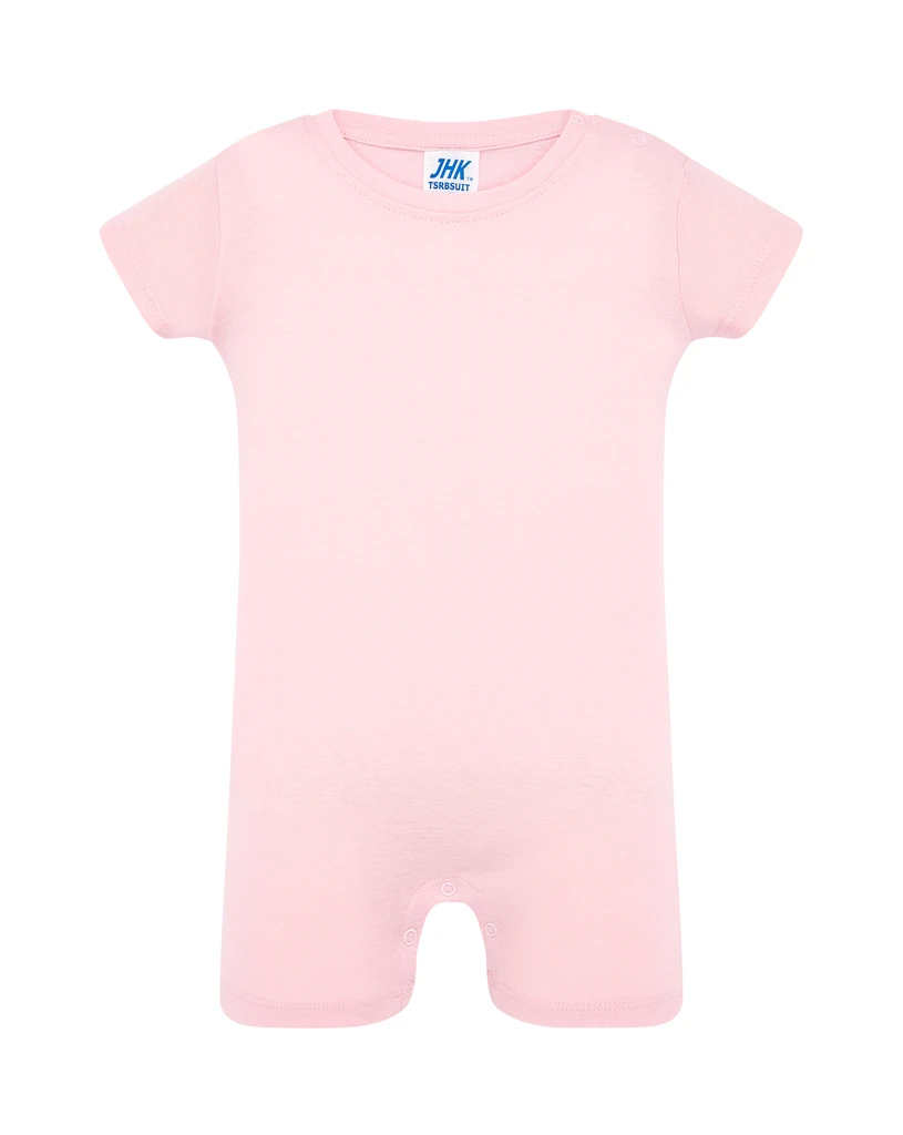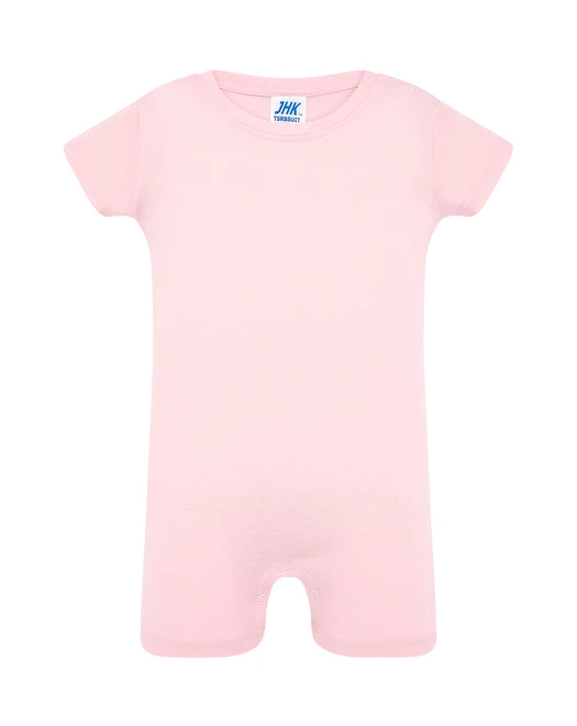 Short baby playsuit with short sleeves, 100% cotton. Ideal to personalize with silkscreen, vinyl or transfer. Available in 5 colors and from size 3 to 12 months. Removable label.