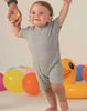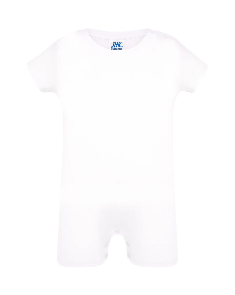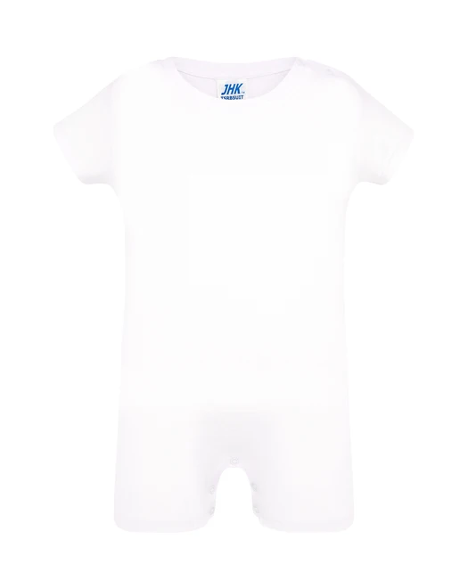 Short baby playsuit with short sleeves, 100% cotton. Ideal to personalize with silkscreen, vinyl or transfer. Available in 5 colors and from size 3 to 12 months. Removable label.