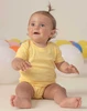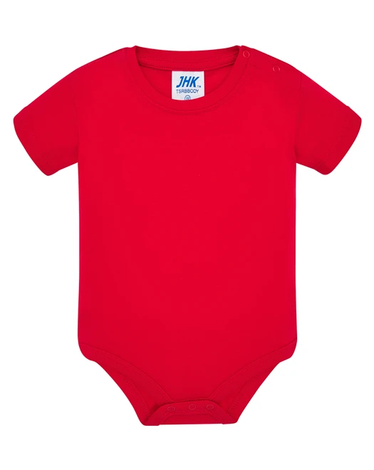 Short sleeve baby grow. Lycra neck. Snap fasteners in shoulder and bottom hem. 1x1 rib.