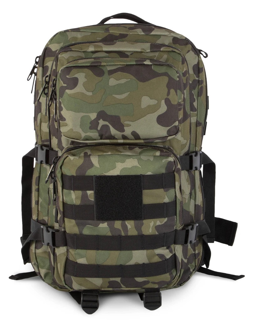loop patches, M.O.L.L.E. webbing, compression straps, ergonomically designed and adjustable padded shoulder straps. All over camouflage print.