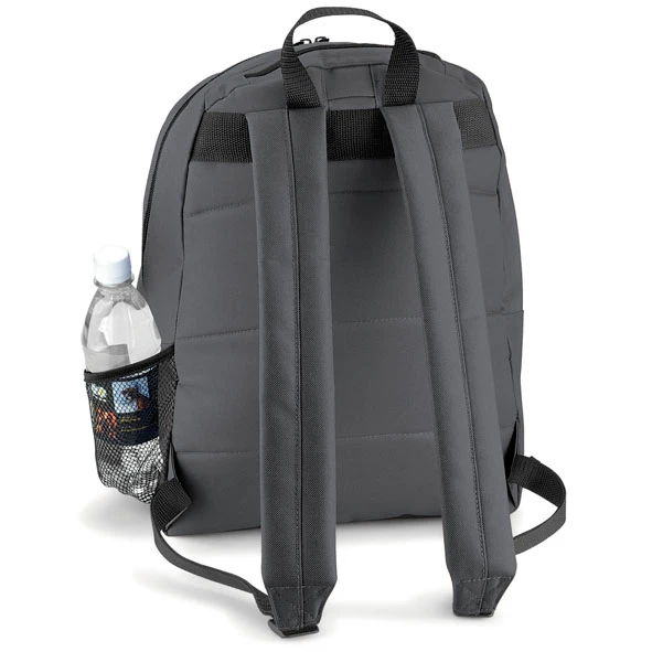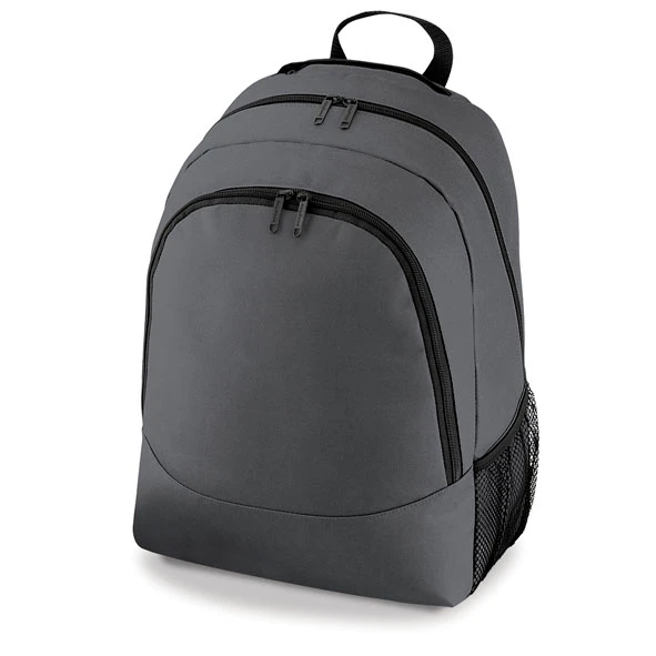 Zippered top pocket, internal organiser section, side mesh pocket, large internal pocket, padded back panel, padded adjustable shoulder straps, grab handle