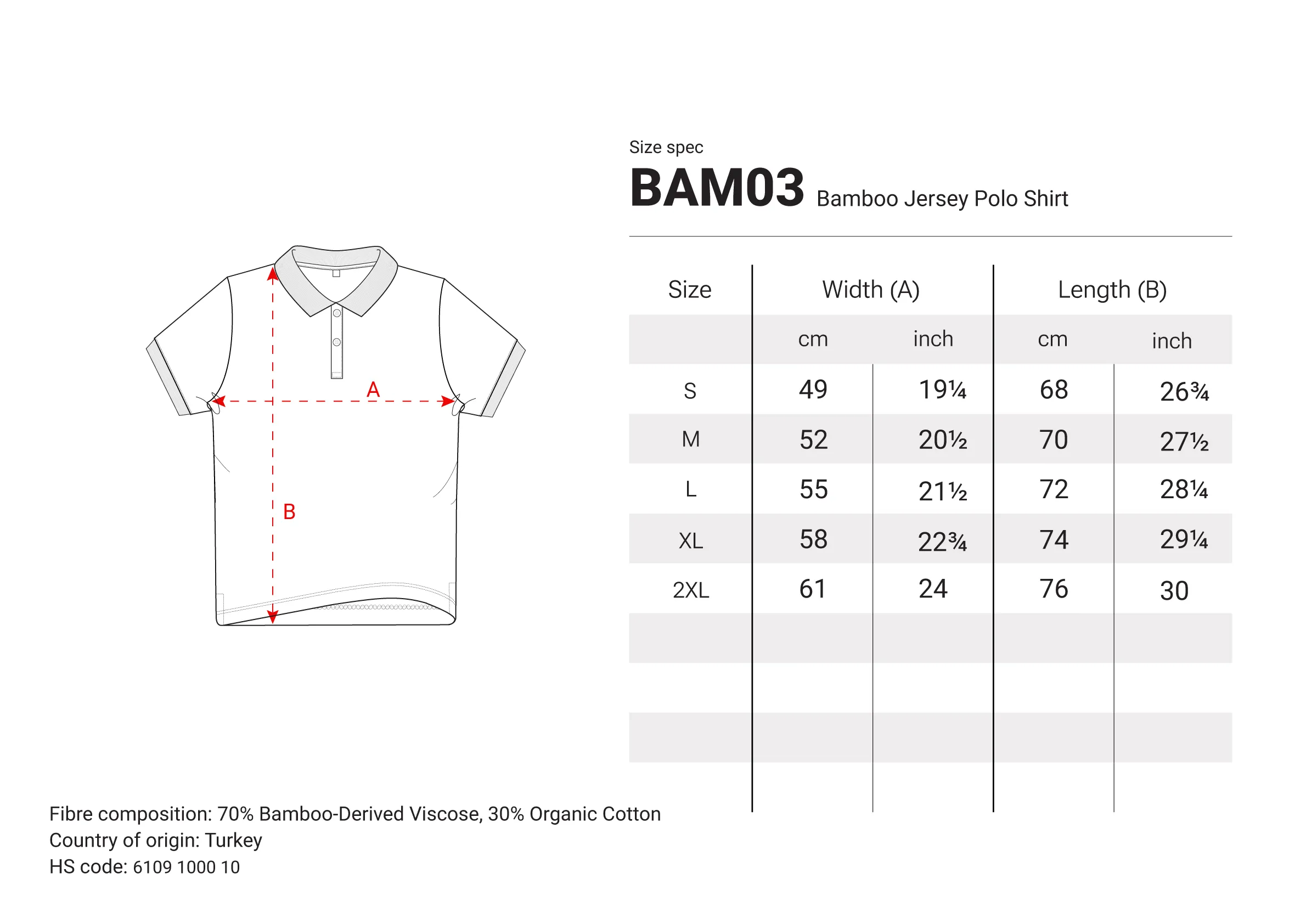 BAM03-BLRefine everyday styling with the Bamboo Jersey Polo Shirt, a contemporary interpretation of a classic silhouette. Crafted from a substantial 180 gsm blend of 70% bamboo viscose and 30% organic cotton, the fabric provides a structured yet comfortable fit with a smooth, premium hand feel.