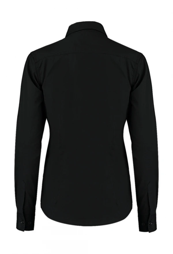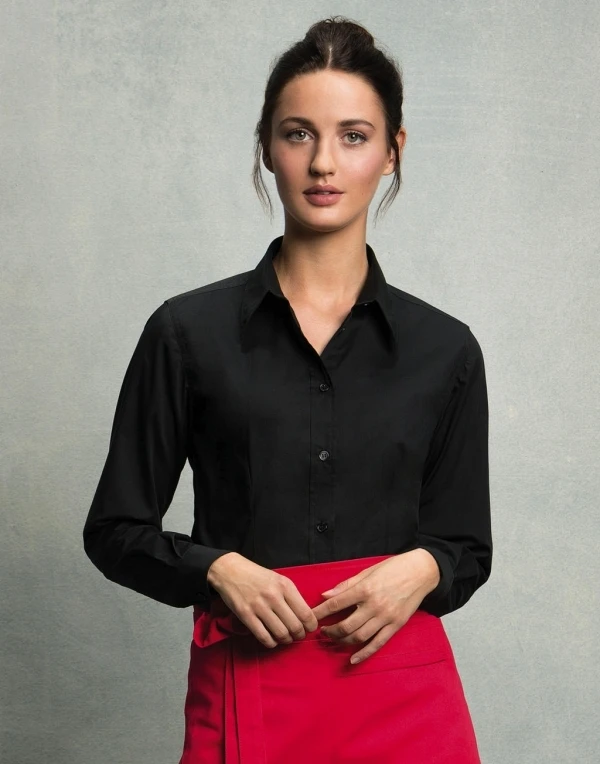 120 gsm • 57 % cotton, 40 % polyester, 3 % lycra • easy care long sleeve blouse • slightly reinforced collar • tone-in-tone buttons • front and back darts for a fitted waist • curved hem.