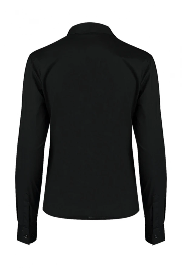 120 gsm • 57 % cotton, 40 % polyester, 3 % lycra • Asia-style easy-care long sleeve blouse • small stand-up collar • tone-in-tone buttons • concealed placket (only top button visible) • front darts for a fitted waist • adjustable cuffs • side vents • slightly rounded hem.
