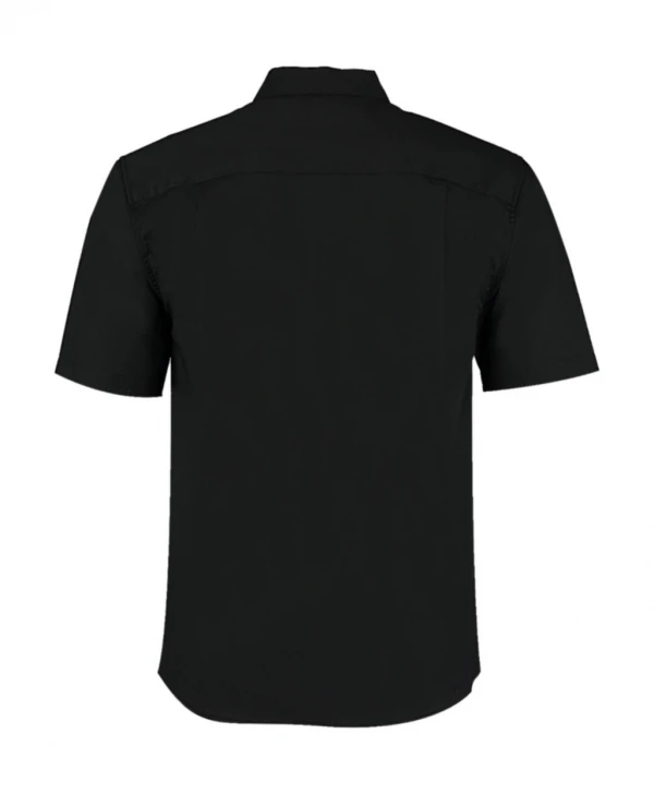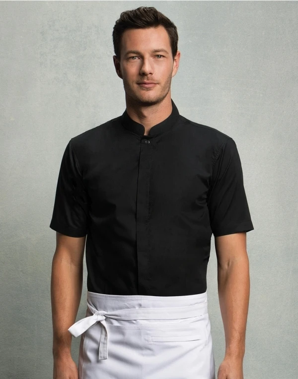 120 gsm • 57 % cotton, 40 % polyester, 3 % lycra • Asia-style easy-care short sleeve shirt • small stand-up collar • back yoke with two inverted pleats • tone-on-tone buttons • concealed placket (only top button visible) • curved bottom hem.
