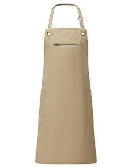 An eco-friendly bib apron, made with a combination of recycled polyester and responsibly sourced cotton. Featuring two handy side pockets with rivet detail. The centre zip pocket comes away to the underside to allow embroidery applications. Contrast stitching features across this apron and oversized antique brass eyelets give an industrial-chic feel to the design.