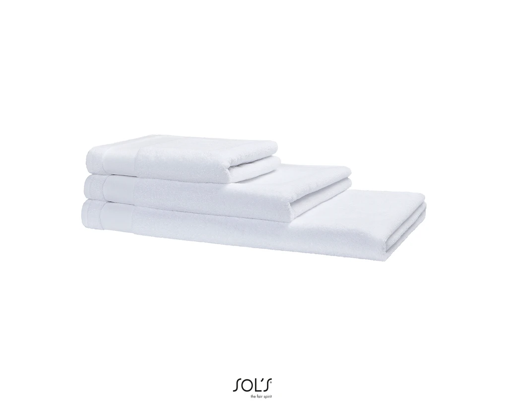 QUALITY: FRENCH TERRY 100% combed cotton; Soft and fluffy French terry towelling, 2-thread loops for better absorbency, 6 cm smooth strip for customisation, Hanging loop; Size: 50 x 100 cm; Certificate: STANDARD 100 by OEKO-TEX®