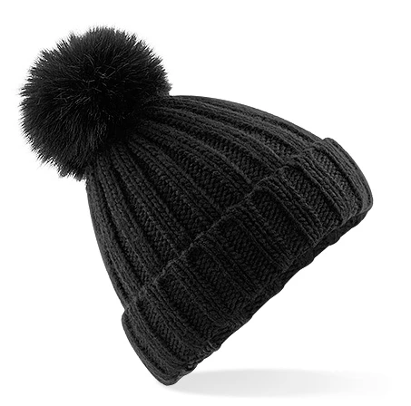 TearAway label for ease of rebranding, luxury self-coloured faux fur pom pom, removable pom pom for ease of washing, unisex styling, cuffed design for optimal decoration, sumptuous heavy ribbed knit