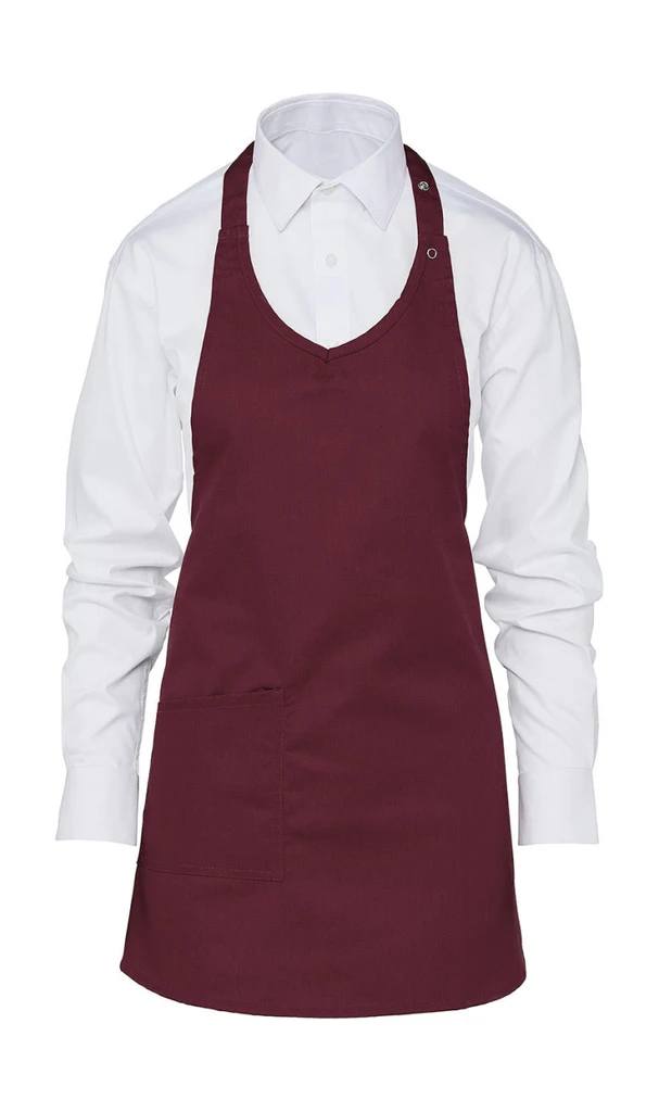 This comfortable short bib apron has a V-neck style with press stud adjustable neckband is smart and functional thanks to its patch pocket, easy care poly-cotton fabric and great washability – 60° for all colours. It's a practical and durable choice.