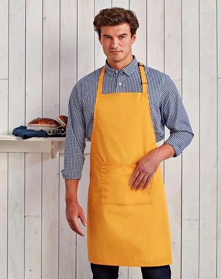 A classic Bib Apron that features a centre pocket with built in pen pocket. Available in 50 colours from the Premier 'Colours Collection’, this apron has a sliding adjustable buckle on the neckband so the wearer can adjust the overall length.