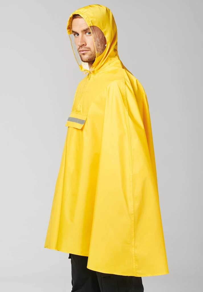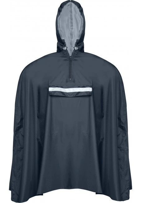 100% polyester with PU coating. Waterproof up to 5000 mm. Zip neck. Taped seams. Hood with transparent lateral safety visors and adjustable cord toggles. Packs/zips into large kangaroo pocket. Inner grips designed for cycling. Reflective trims at back and front pocket. Height : 90 cm - Width : 155 cm
