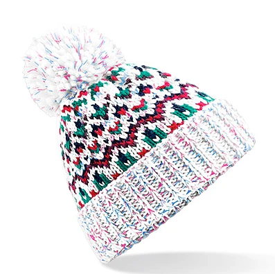 TearAway label for ease of rebranding, cuffed design for optimal decoration, self-coloured pom pom, contemporary geometric pattern
