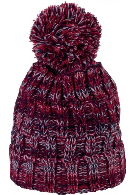 100 % acrylic. Bobble beanie with turn-up. Hand-knitted look with 3 different coloured yarns.