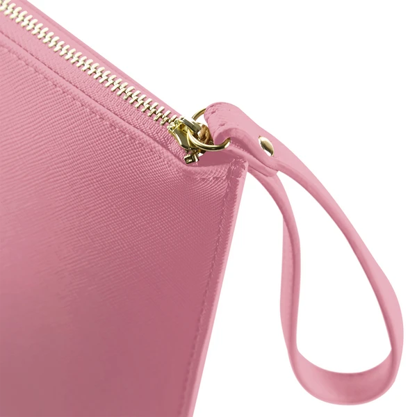 Material: 100% Leather-look PU; Dimensions: 26 x 17 cm; TearAway label for ease of rebranding, saffiano fine grain, multi-purpose use, high shine gold metal zip, zippered main compartment, internal foam padding, soft-touch lining, wristlet strap
