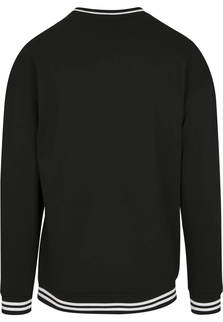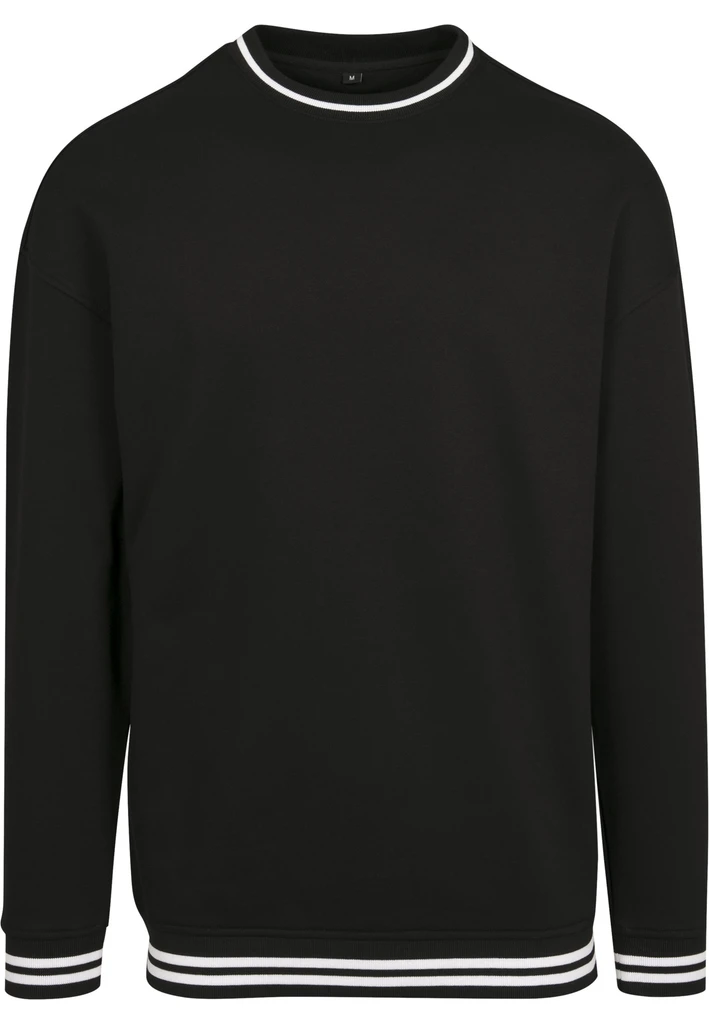 Composition: 65% Cotton / 35% Polyester; 300gsm; overlapping shoulders, round neck, striped cuffs at sleeves, hem and neckline, roughened sweat fabric on the inside, half moon neck