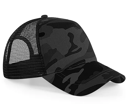 TearAway label for ease of rebranding, 5 panel design, pre-curved peak, camouflage detailing, retro style Snapback size adjuster